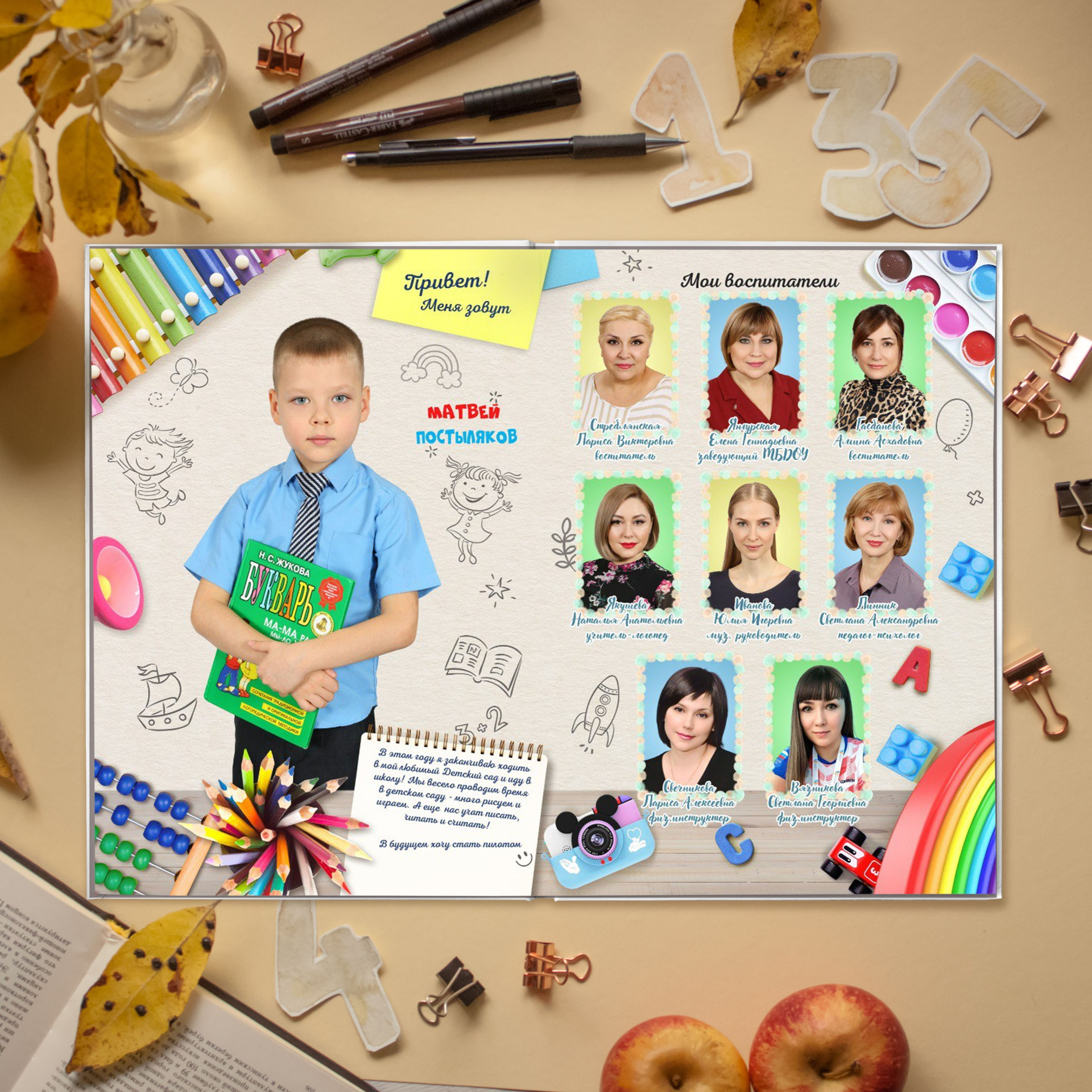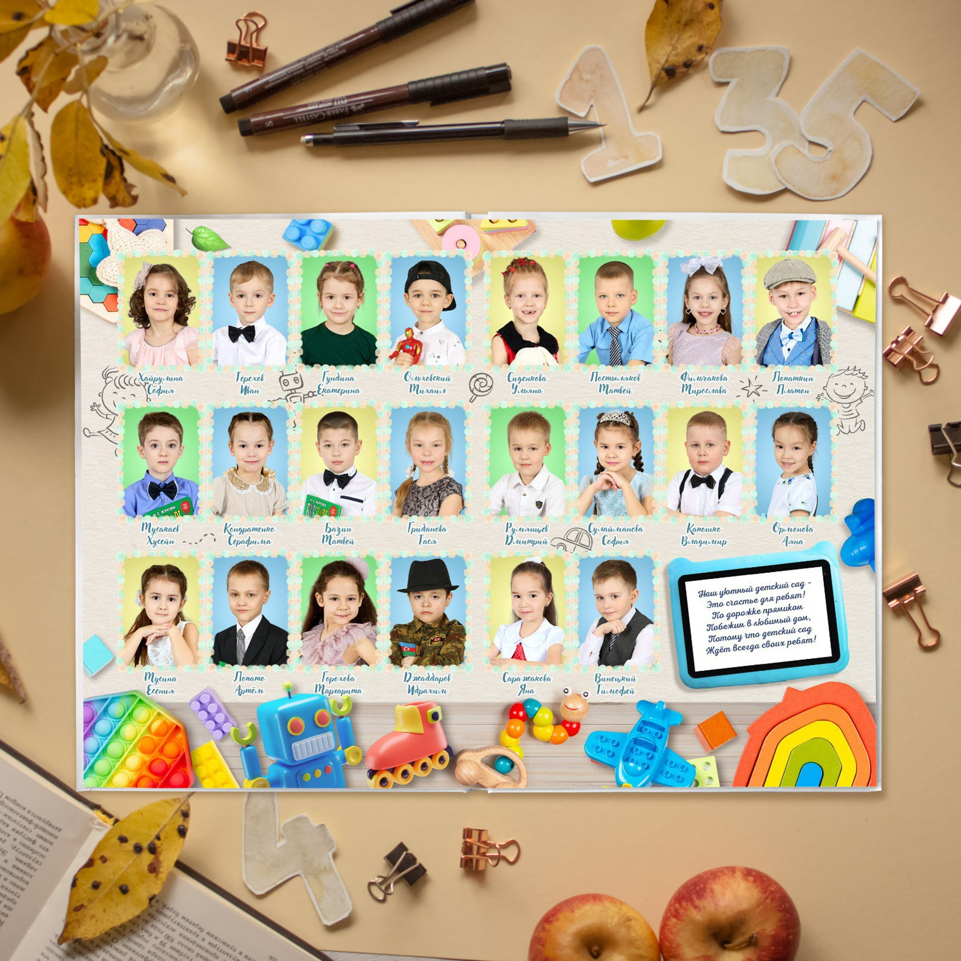 Формат А4, портрет на первой странице альбома, 3 разворота. Одна общая фотография группы.