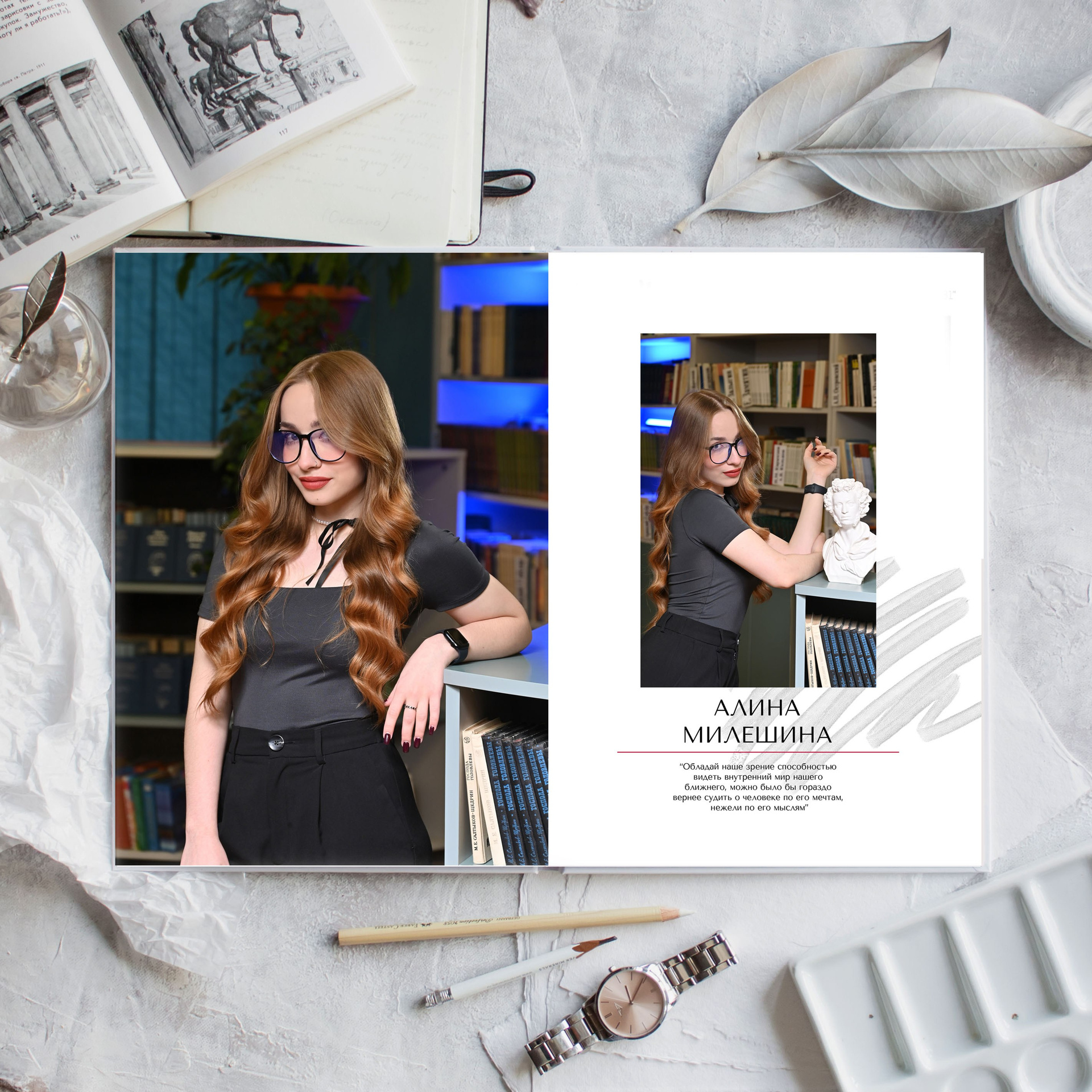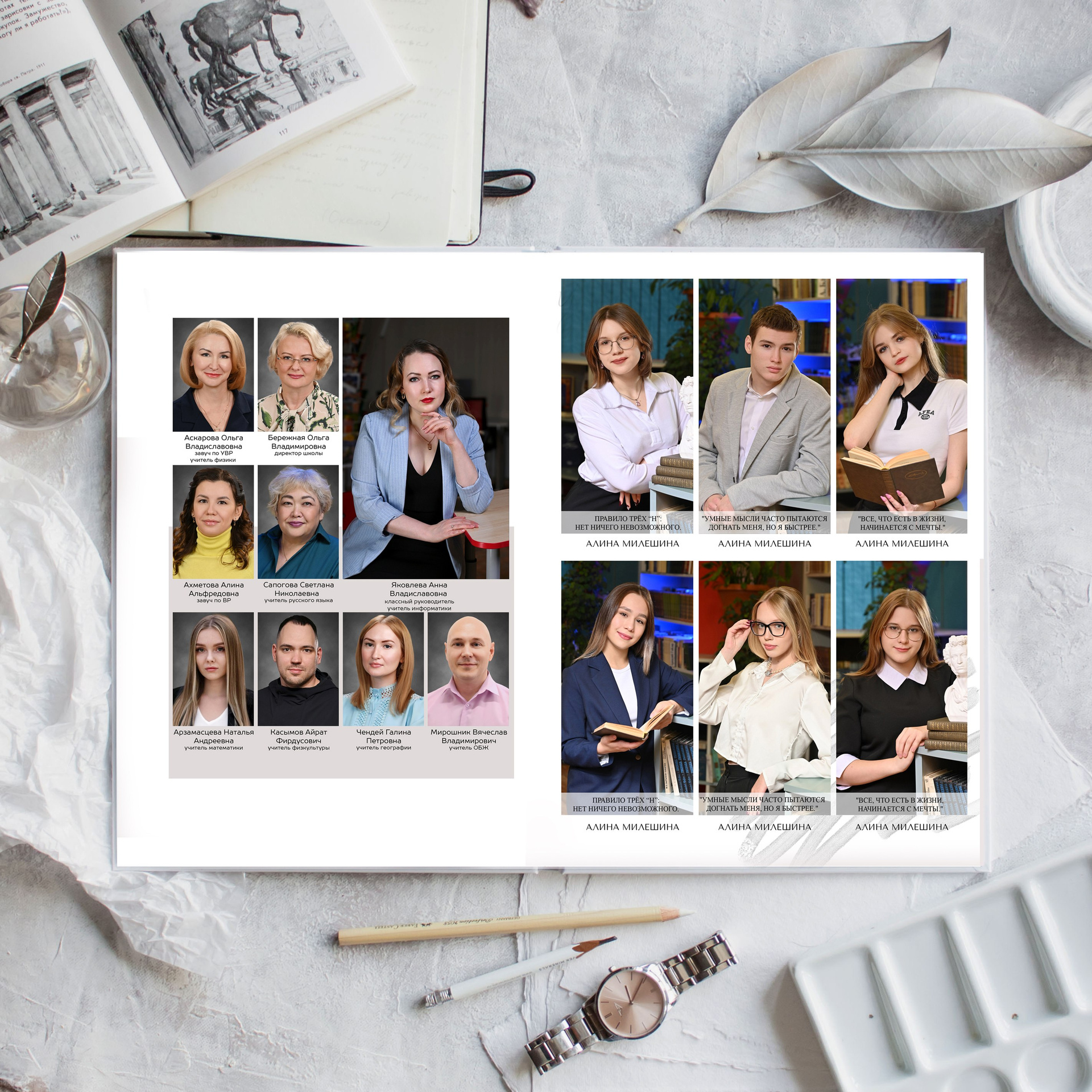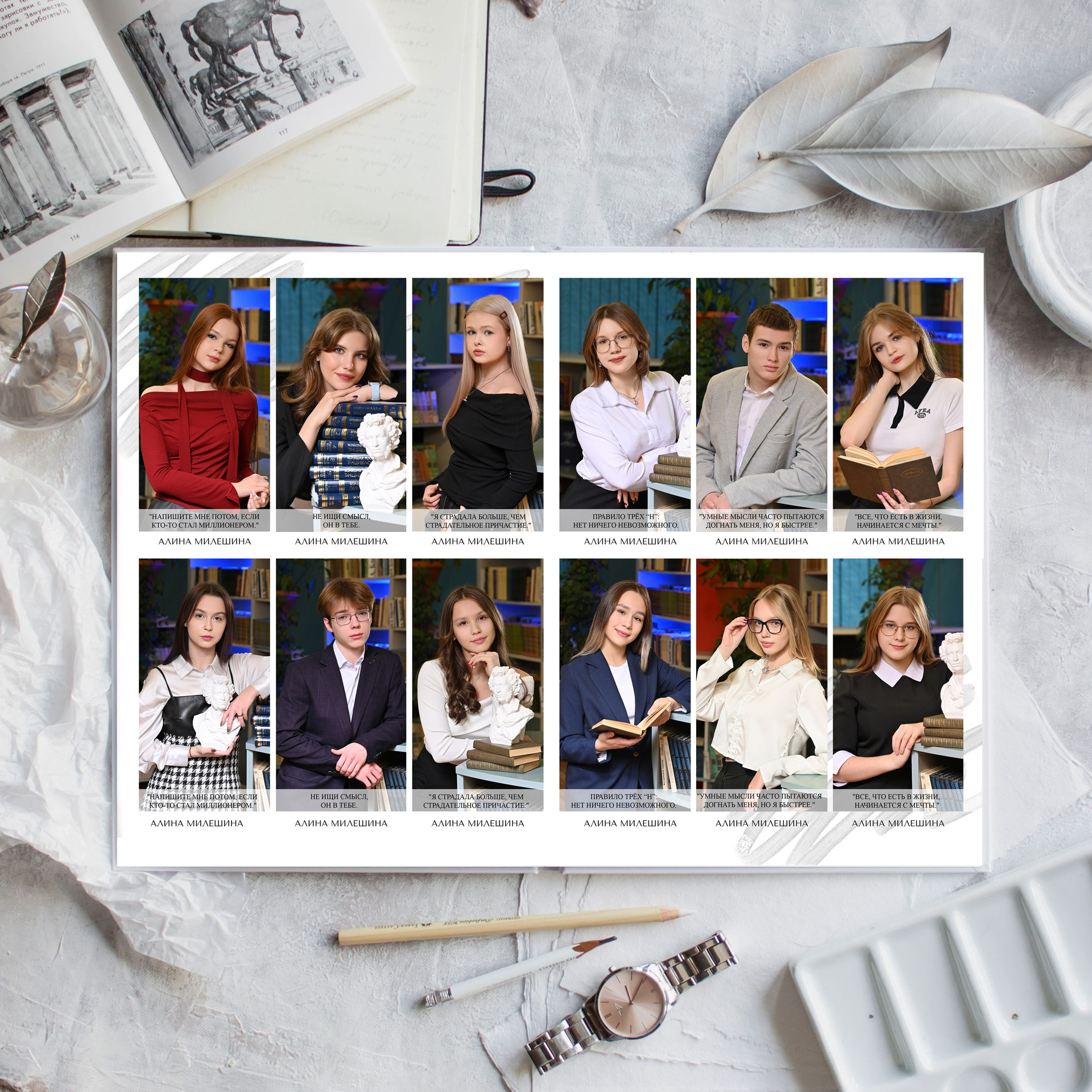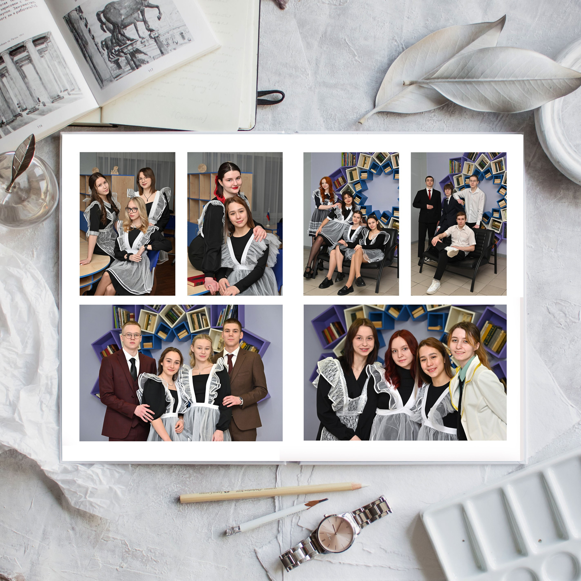 Индивидуальный разворот с двумя портретами выпускника. Учителя, одноклассники и 4-8 групповых фотографий.