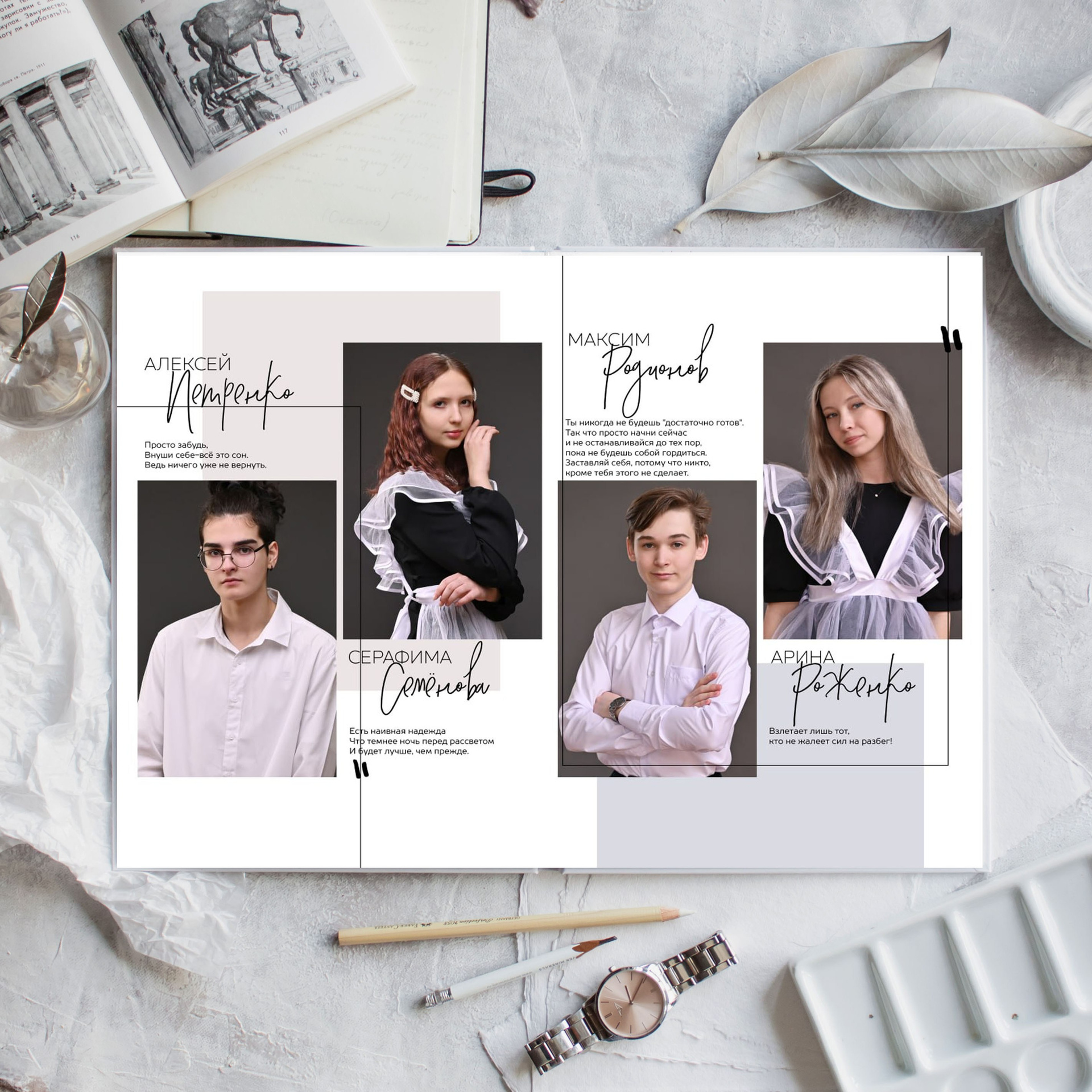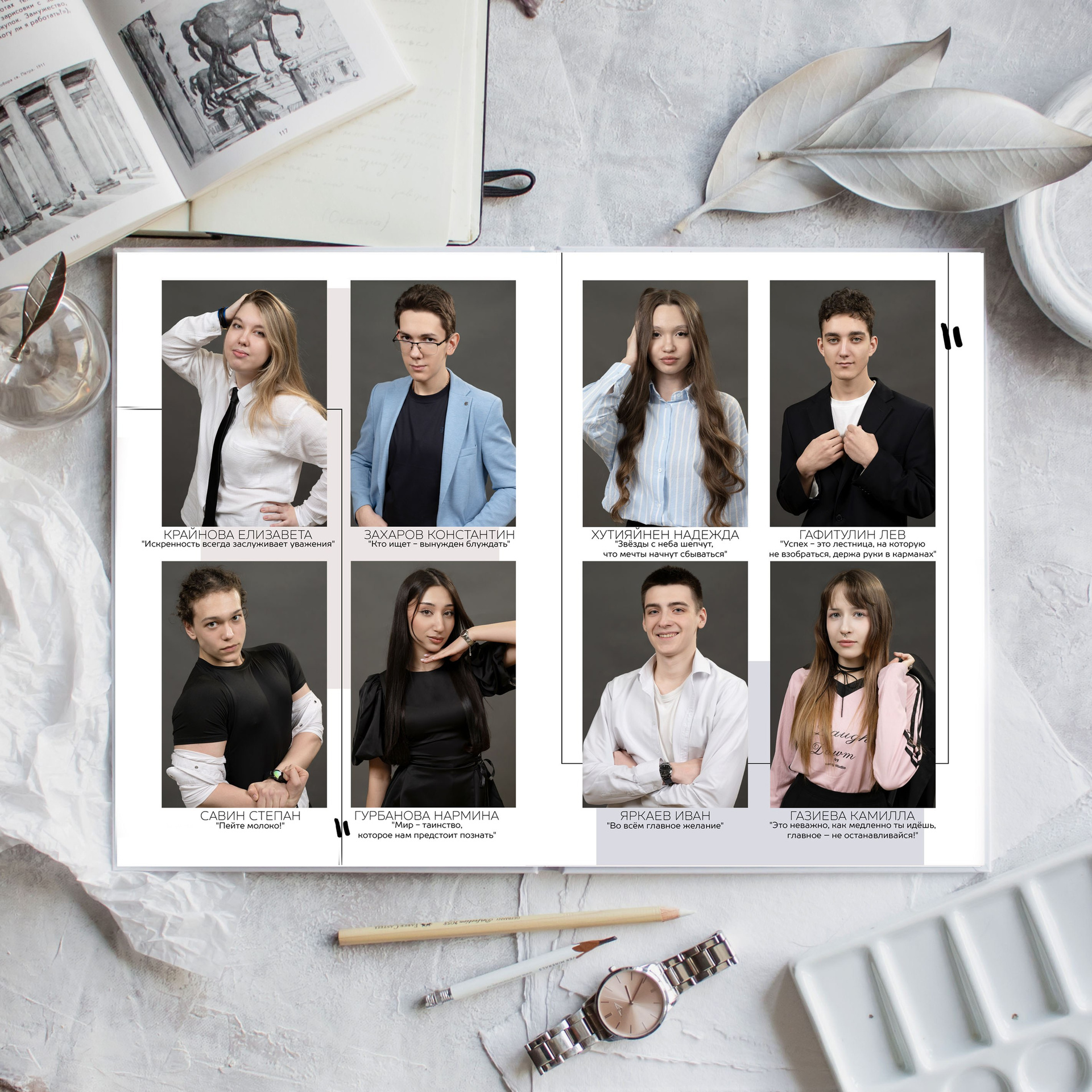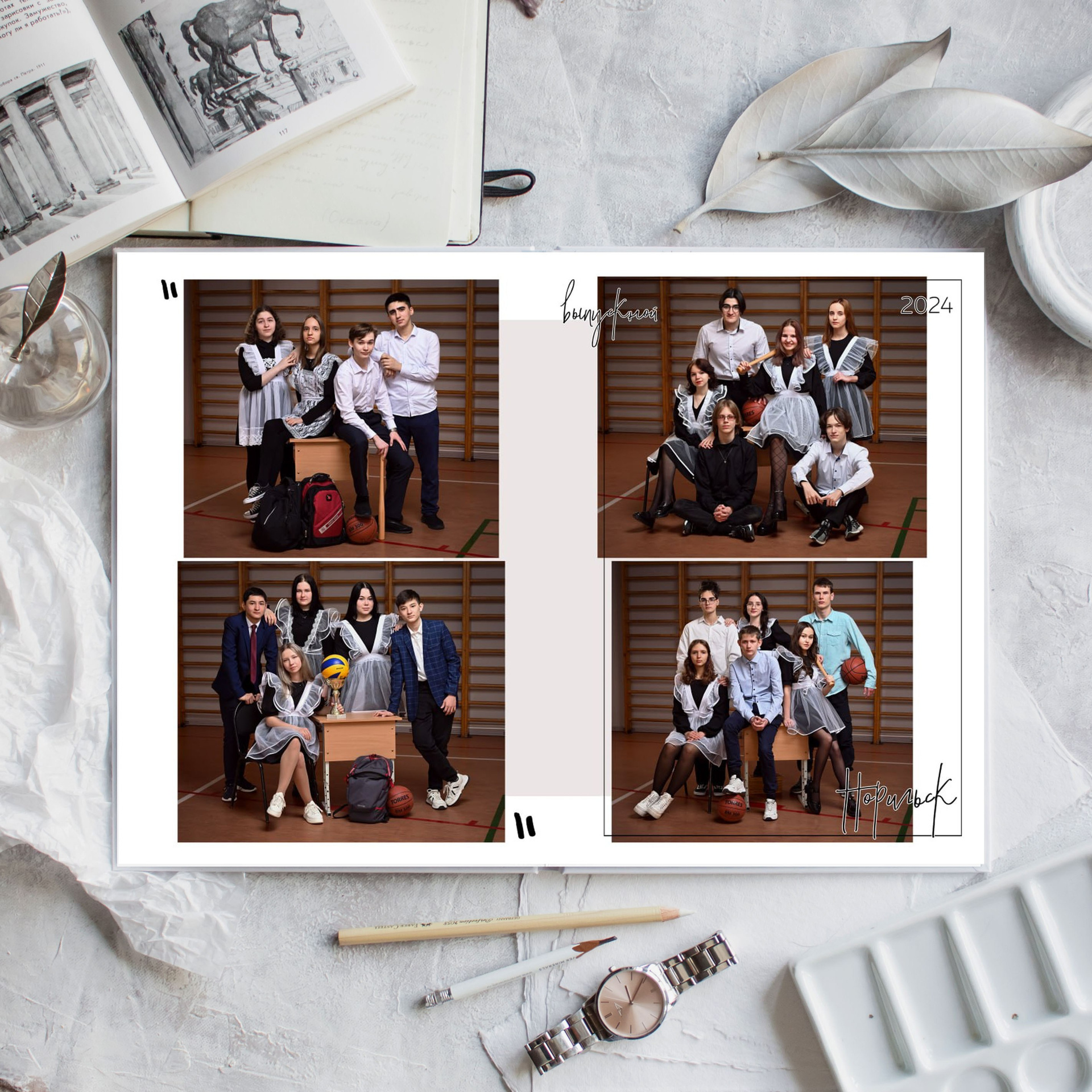 Формат А4, индивидуальный портрет на первой странице, 4 выпускника на развороте, 4 групповые фотографии и 1 общий кадр класса.