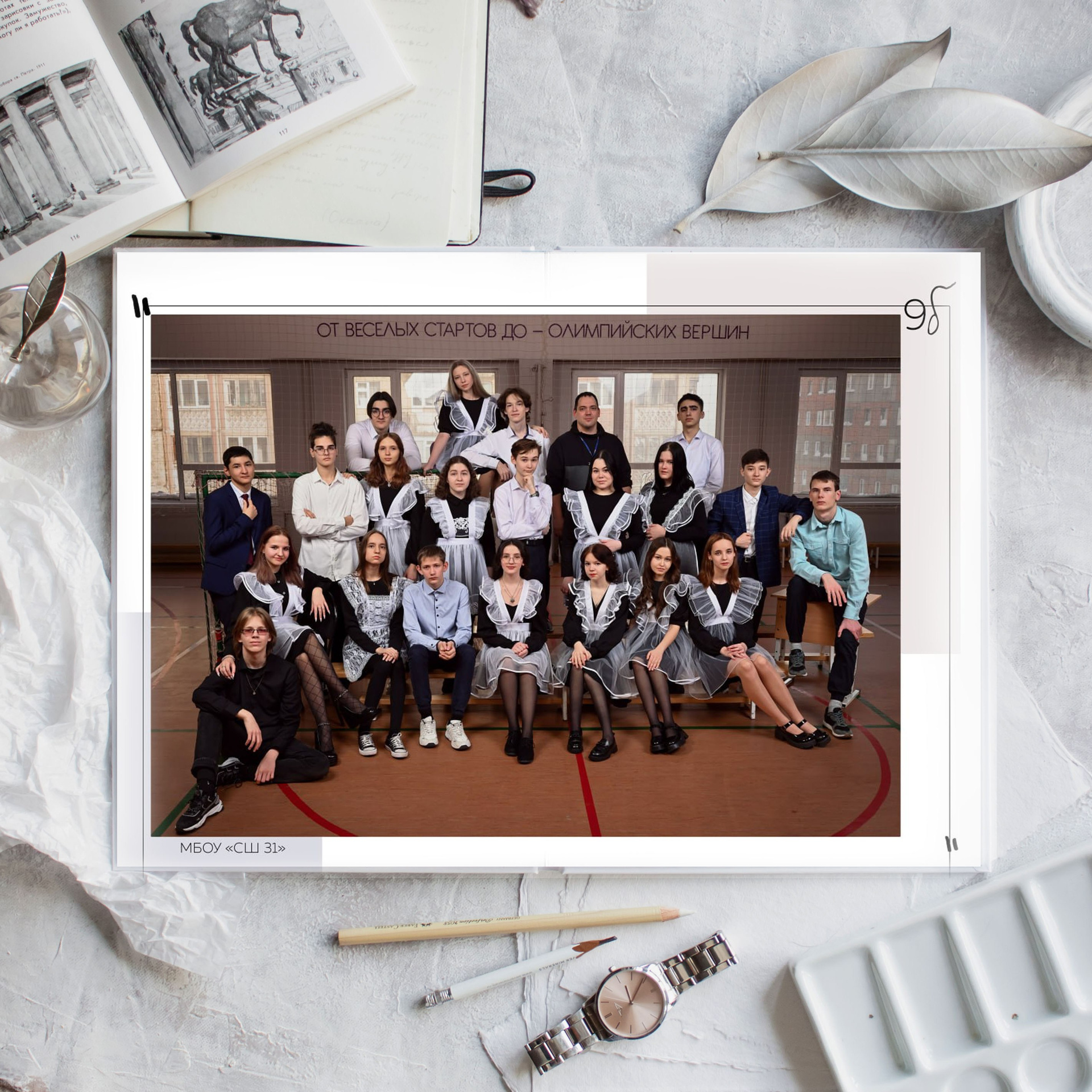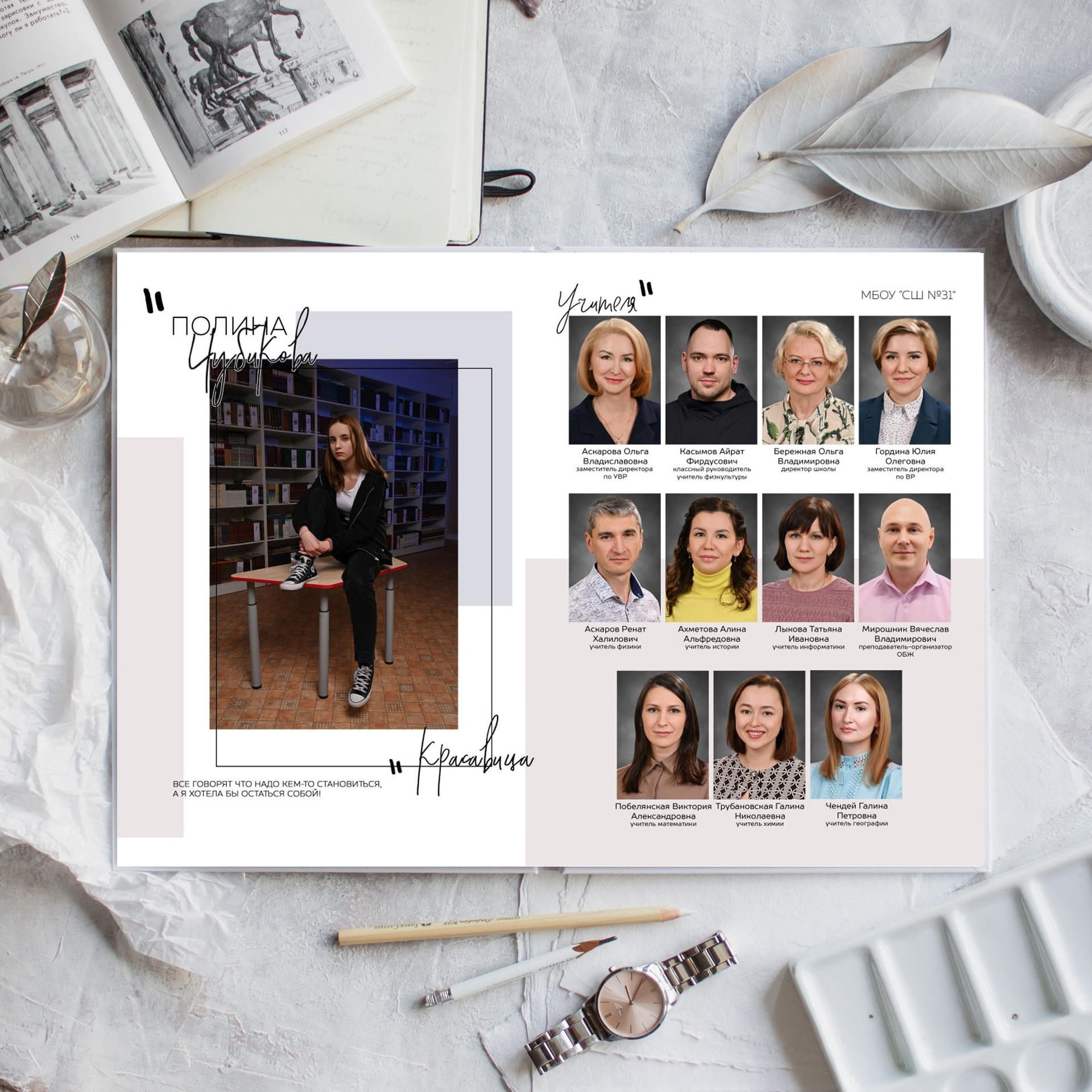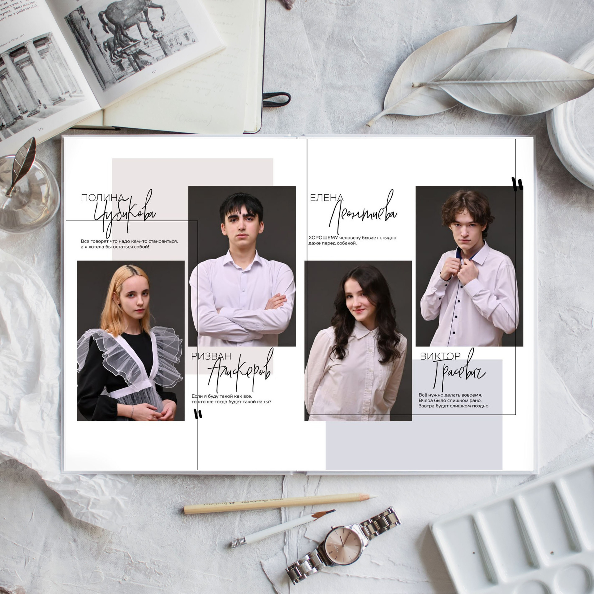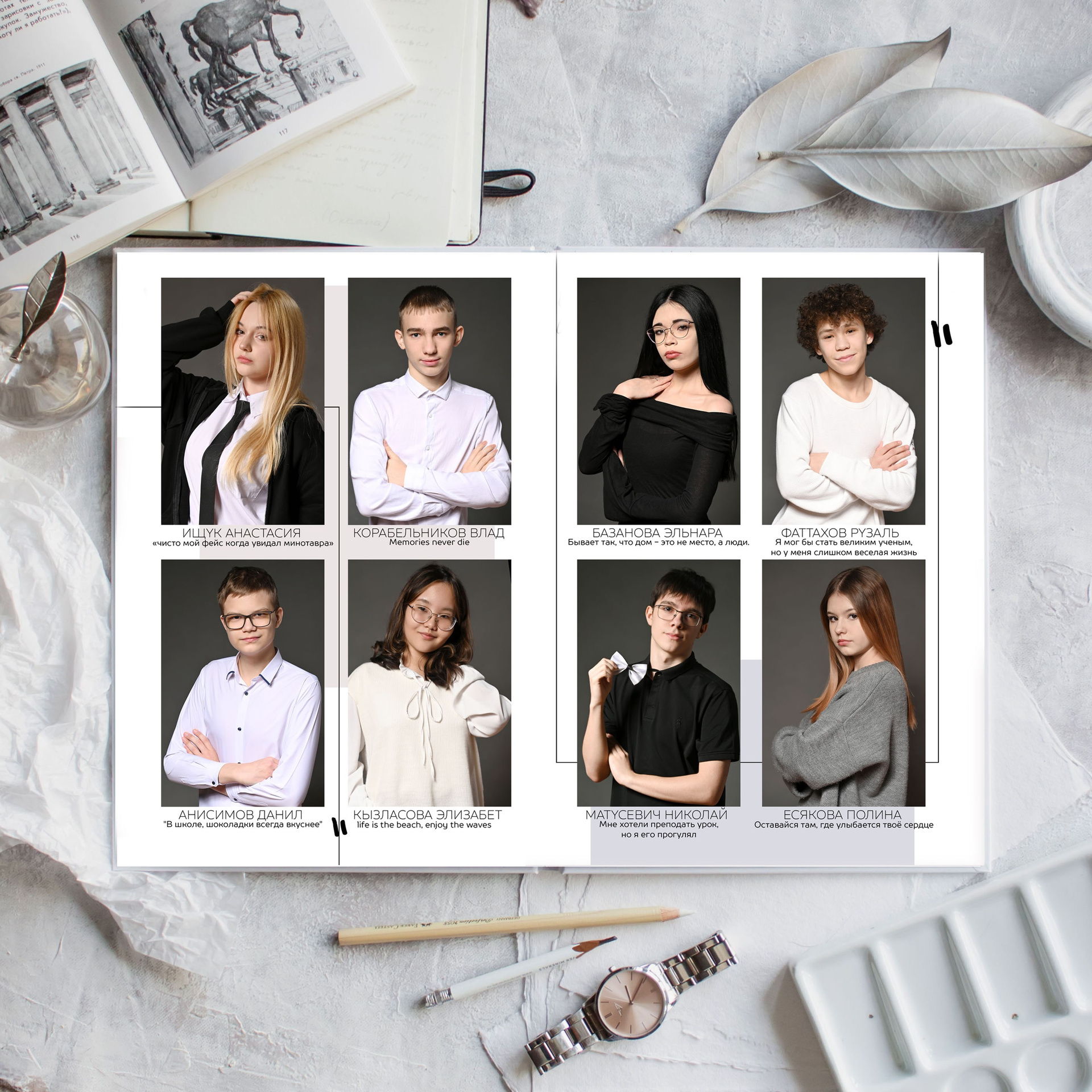 Формат А4, индивидуальный портрет на первой странице, 4 выпускника на развороте, 4 групповые фотографии и 1 общий кадр класса.